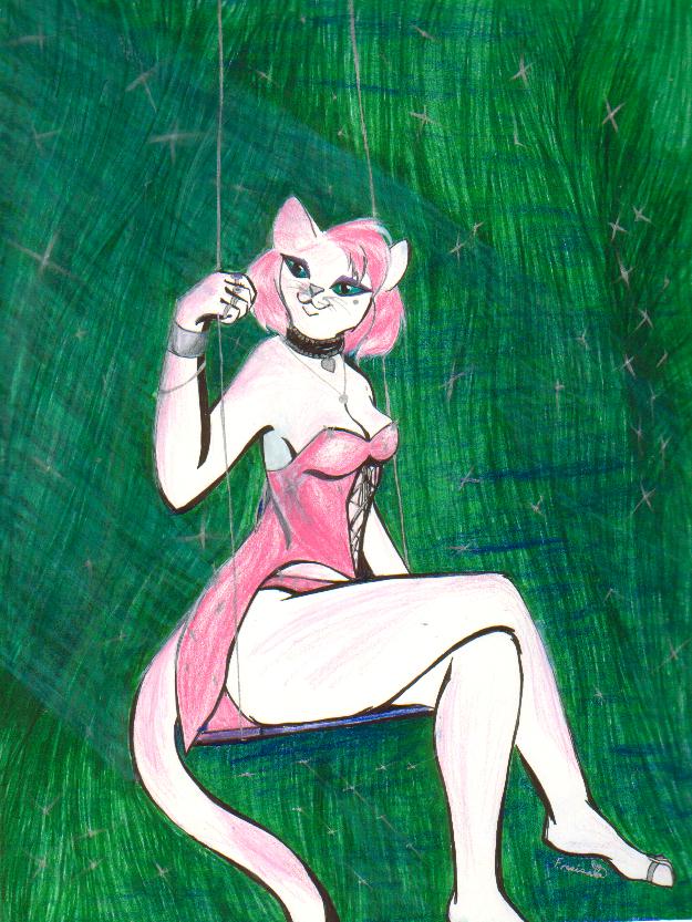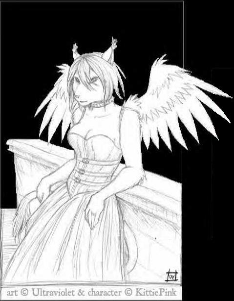 Here's a beautiful picture of KittiePink done by the Aisha. Eventhough Kittie is a cat, she is looking as if she's quite modest! I absolutely love the face in this picture so much. She also made me a plushie to go with this picture. Was totally adorable! Sadly said plush was destroyed in a flood that happened.